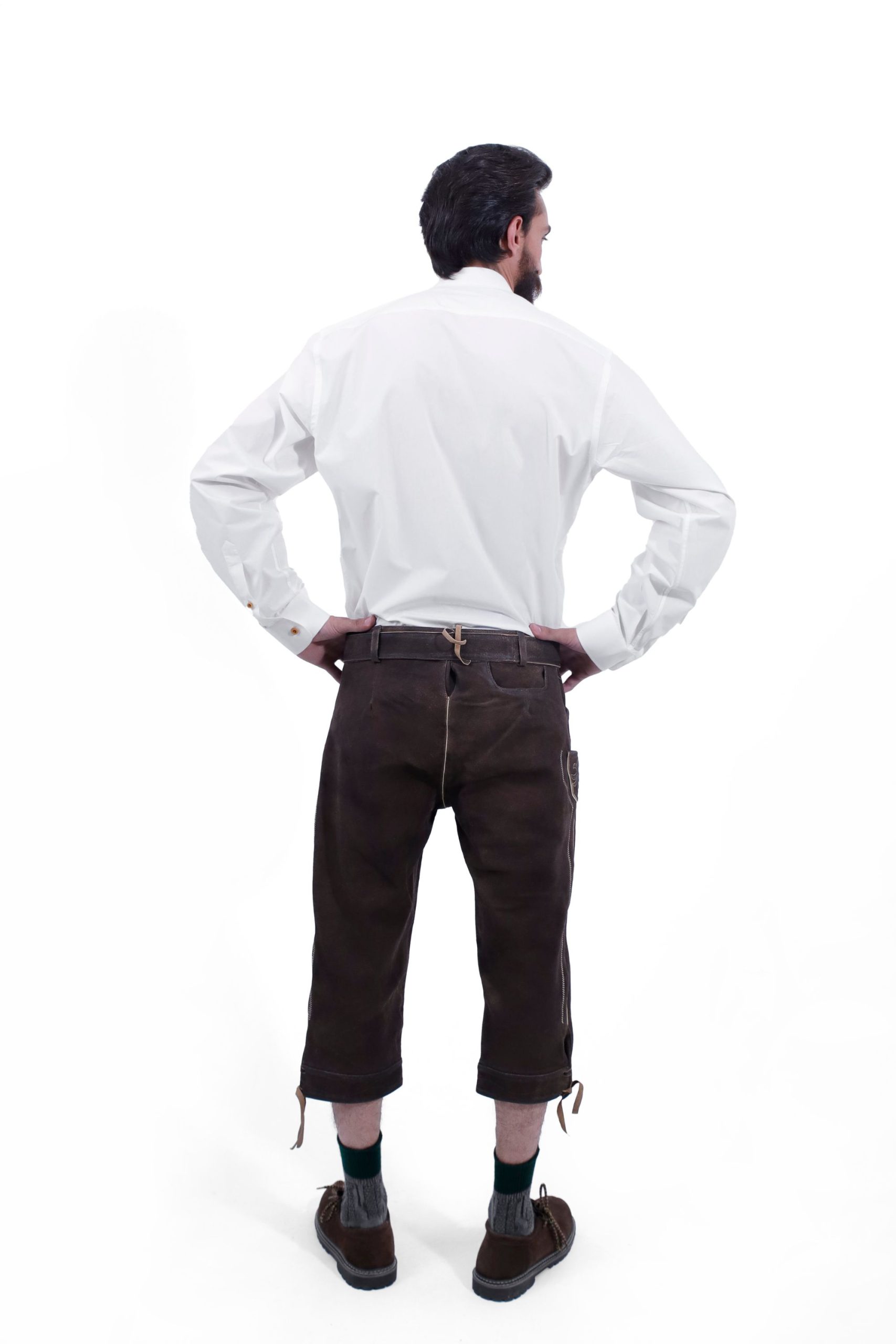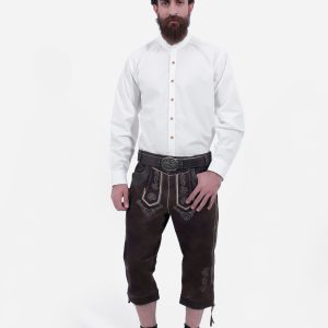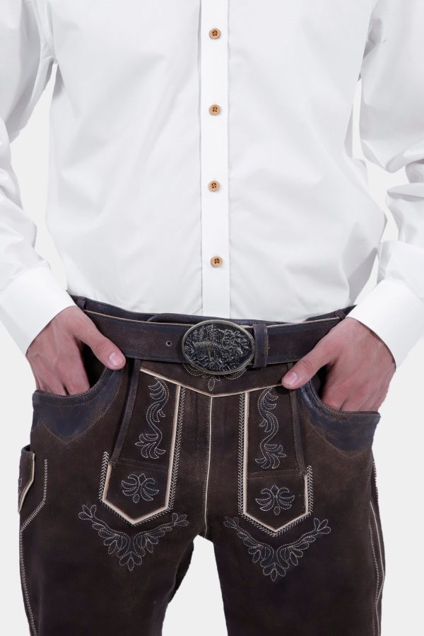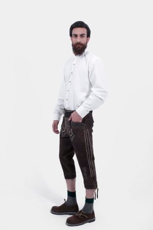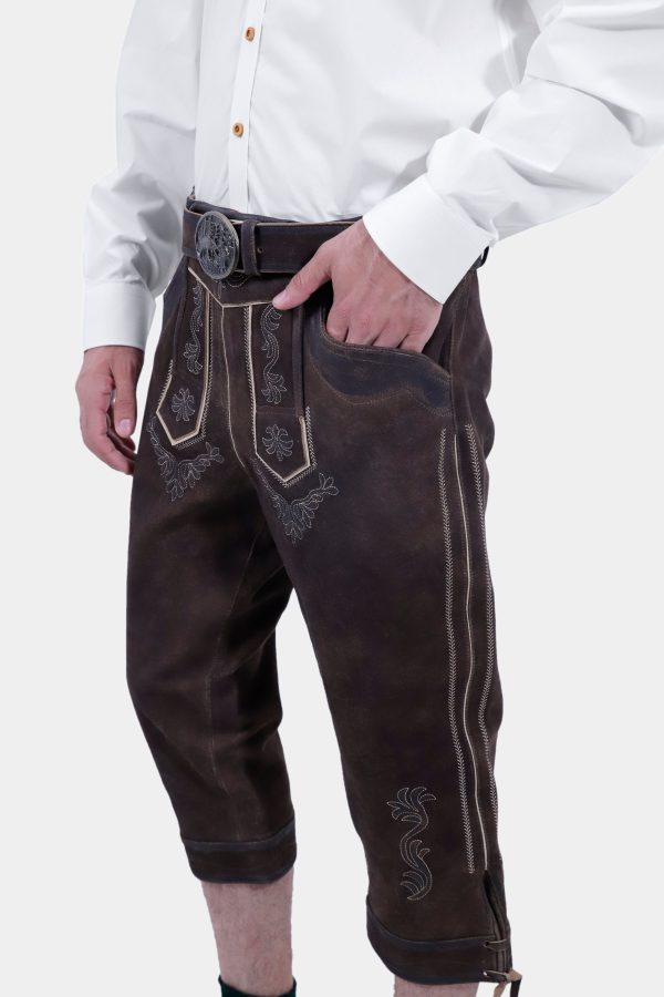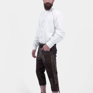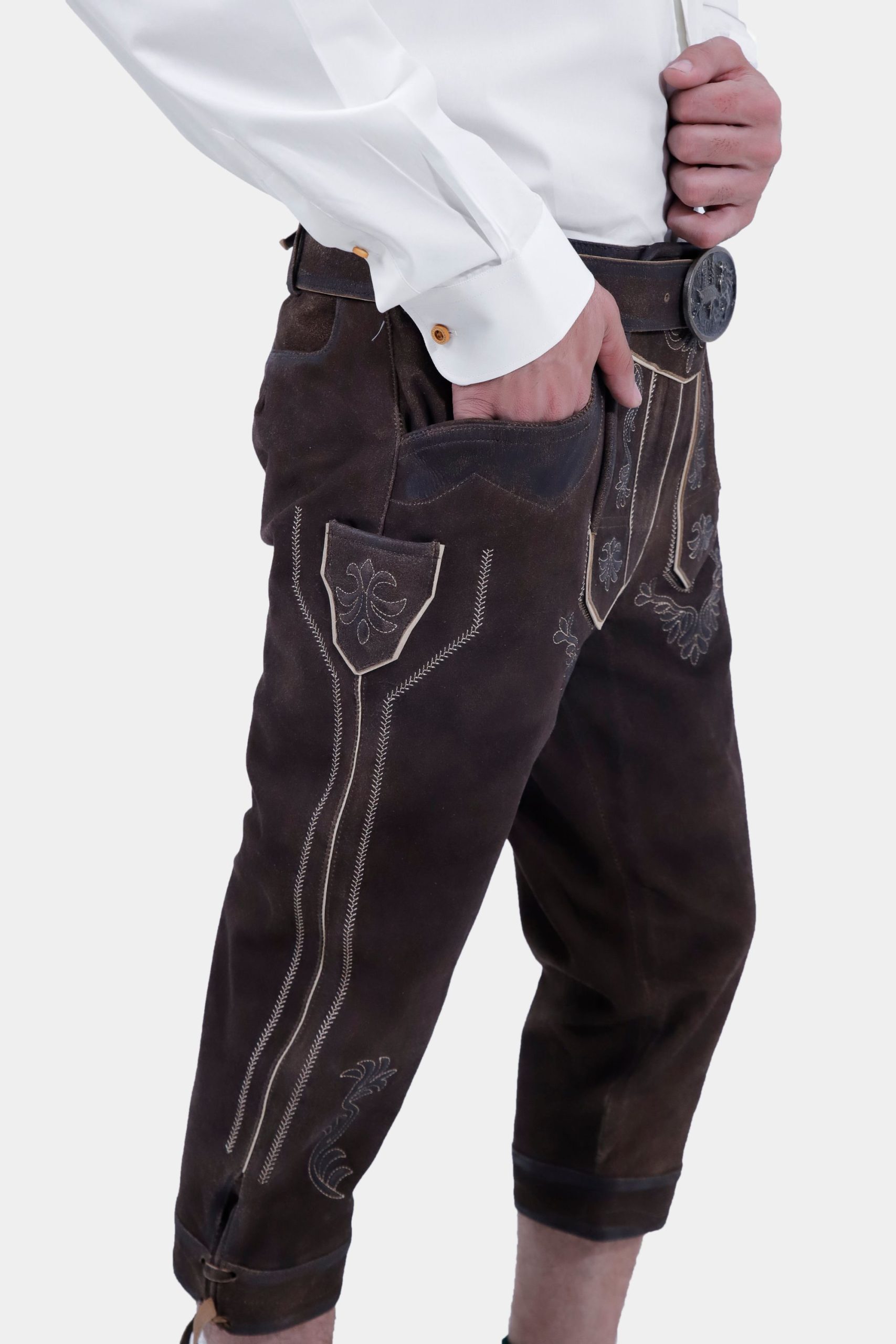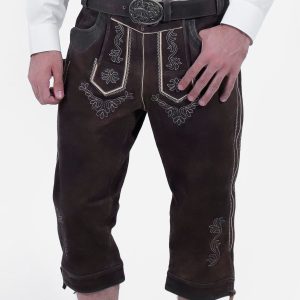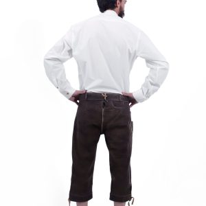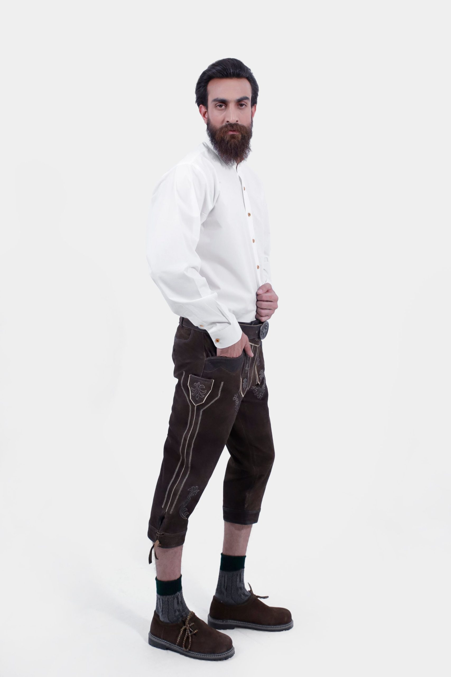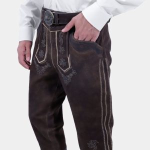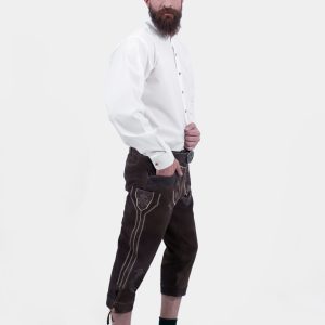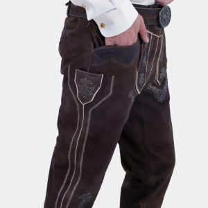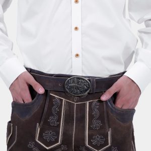 Are you ready to elevate your traditional Bavarian attire? The “Alhambra Bundhosen” are just what you need. These knee-length german bundhosen pants, crafted in a stunning Midnight Walnut color, are made from durable buckskin leather. Adorned with natural-colored embroidery on the bib and legs, they add a touch of elegance to your outfit. With two front pockets, a back pocket, and a side knife pocket, you’ll have plenty of space for essentials. The adjustable waistband and cuffs with leather ties ensure a perfect fit. Finished with traditional brown horn buttons on the bib, these bundhosen are both stylish and practical.