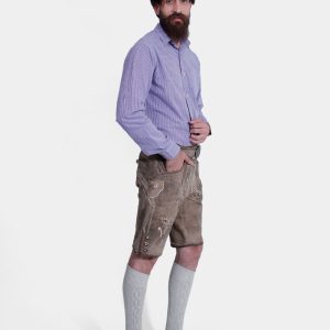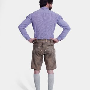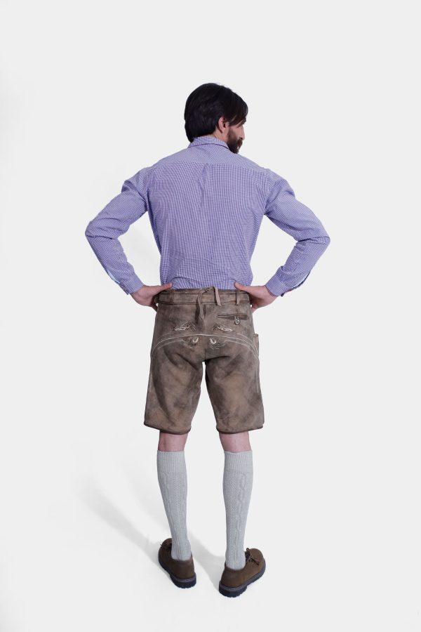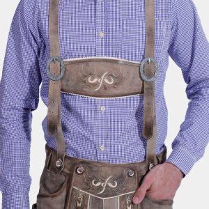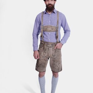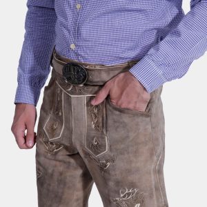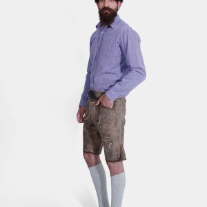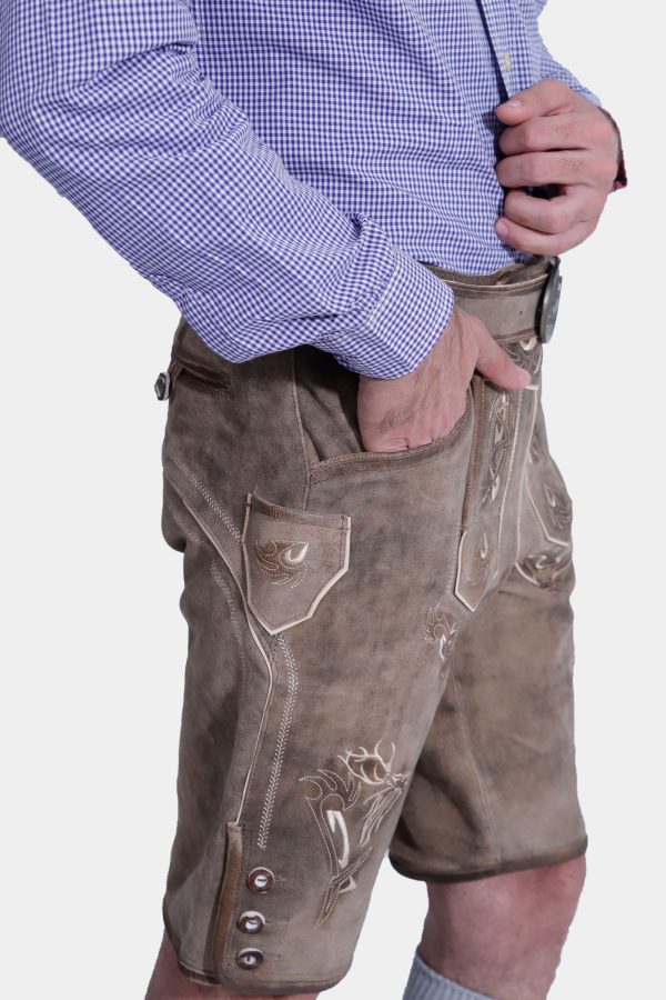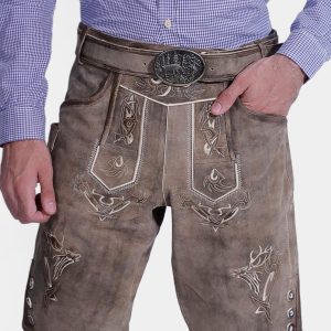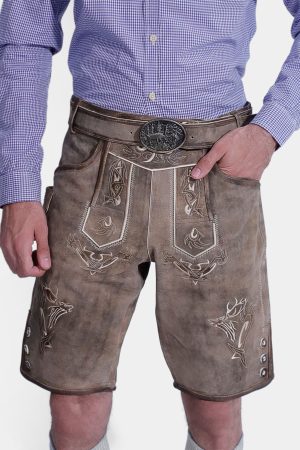 Introducing the Alpine Adventure Chiemsee Lederhosen – the epitome of Bavarian tradition and rugged elegance. These lederhosen shorts, crafted from premium goatskin leather, boast a natural-light brown hue that exudes rustic charm. The intricate embroidery in a natural color adorns the bib and legs, showcasing exquisite craftsmanship. Practicality meets style with two front pockets, a back pocket, and a handy knife pocket on the side, ensuring you have all the storage you need. The back waistband offers a comfortable and adjustable fit, enhanced by brown horn buttons on the leg cuffs for a classic finish. Ideal for Oktoberfest or any alpine adventure, these lederhosen shorts are a must-have for any wardrobe.