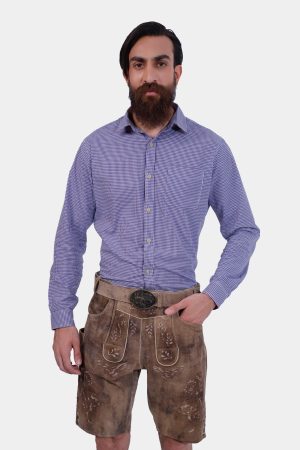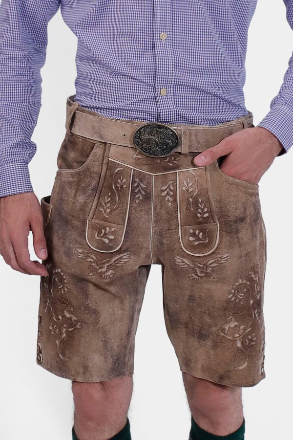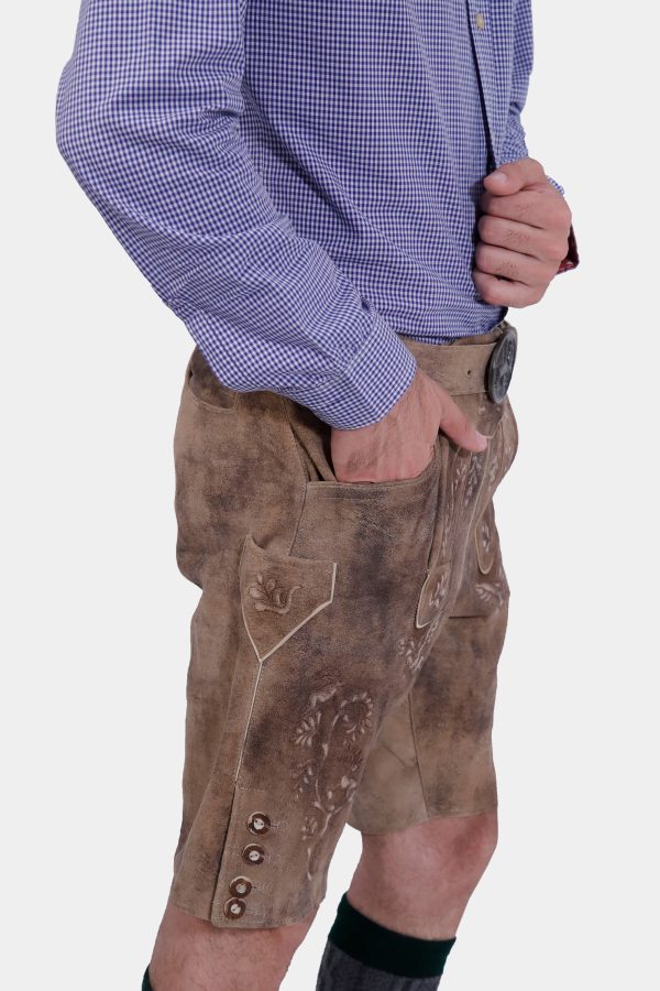 Experience the tradition and elegance of the “Alpine Eagle Lederhosen.” Made from premium chamois leather, this lederhosen shorts in Mountain Chestnut radiates timeless charm. The intricate embroidery in natural colors adorns the bib and legs, showcasing exquisite craftsmanship. Practicality meets style with two front pockets, a back pocket, and a side knife pocket, providing ample storage. The waistband, adjustable at the back and cuffs, ensures a comfortable fit. Finishing touches include brown horn buttons on the leg cuffs, adding a classic Bavarian touch. Perfect for Oktoberfest or any festive occasion, these lederhosen combine heritage with modern functionality.