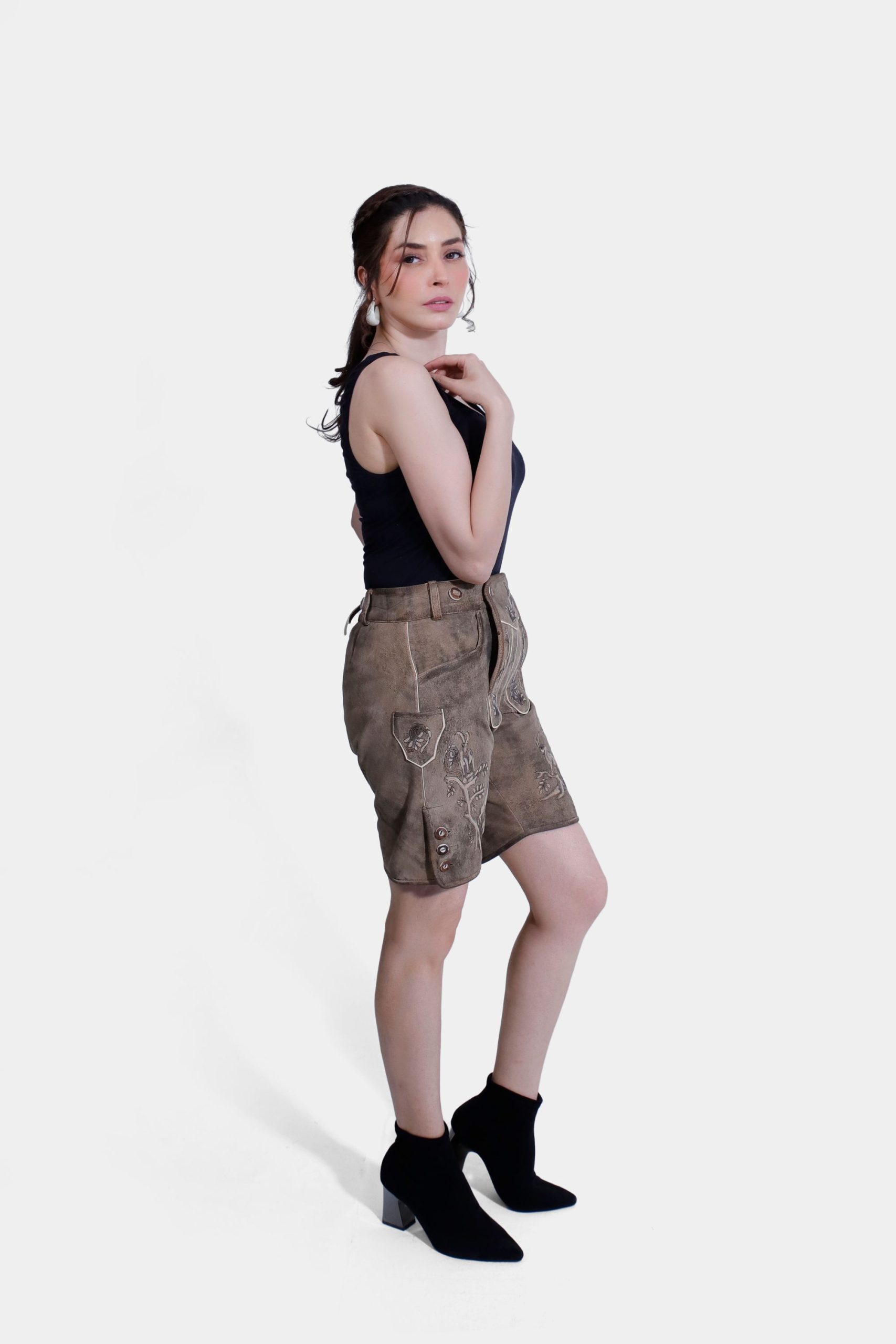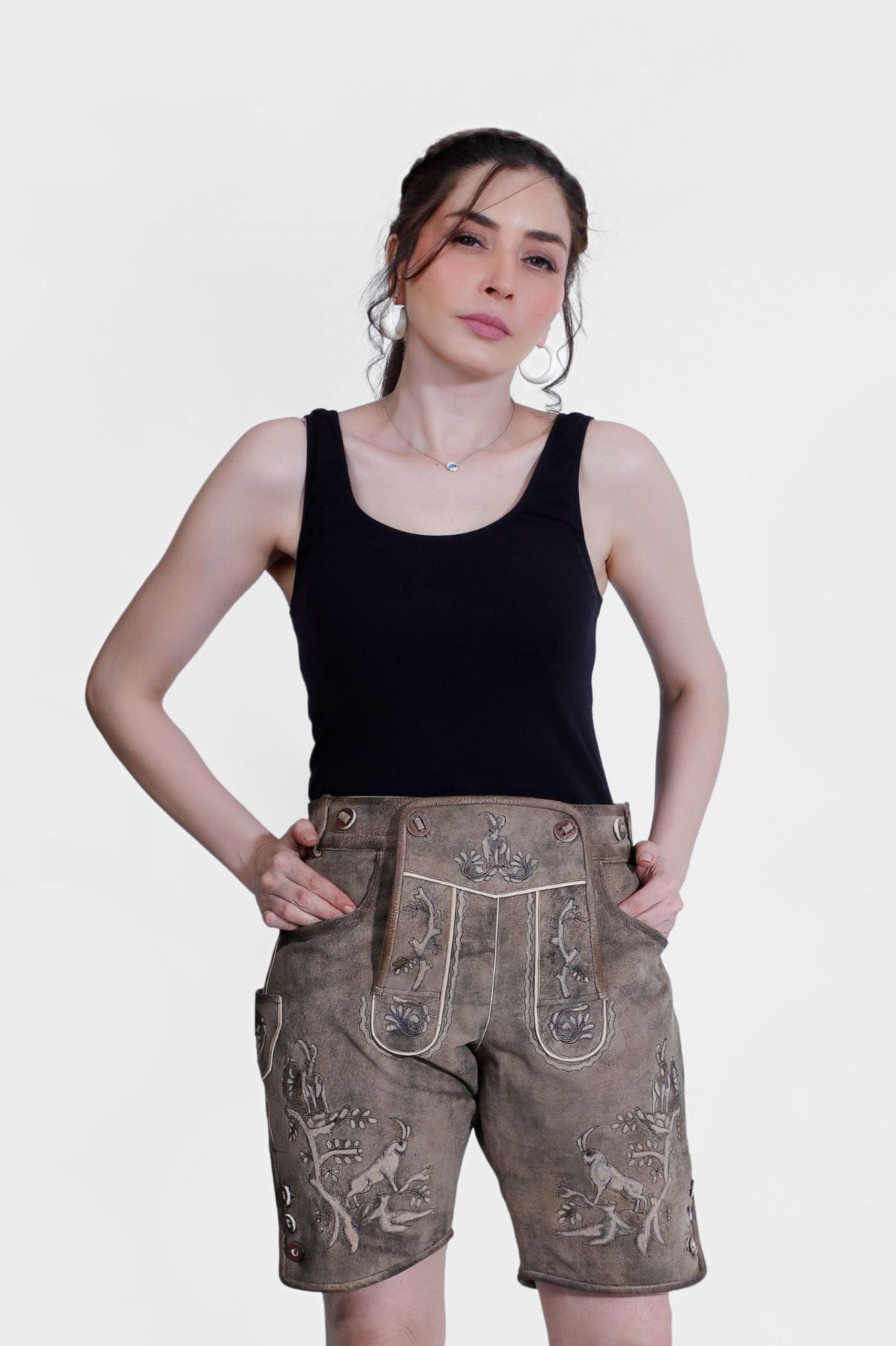 Introducing the Alpine Regal Lederhosen, the epitome of Bavarian craftsmanship and tradition. Crafted from premium goatskin leather in the rich, exotic shade of Desert Oak, these women lederhosen shorts are a true testament to quality and style. The bib and legs are adorned with intricate embroidery in natural hues, reflecting the timeless beauty of traditional designs.