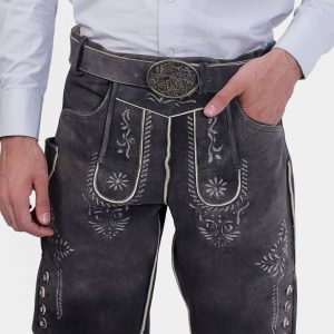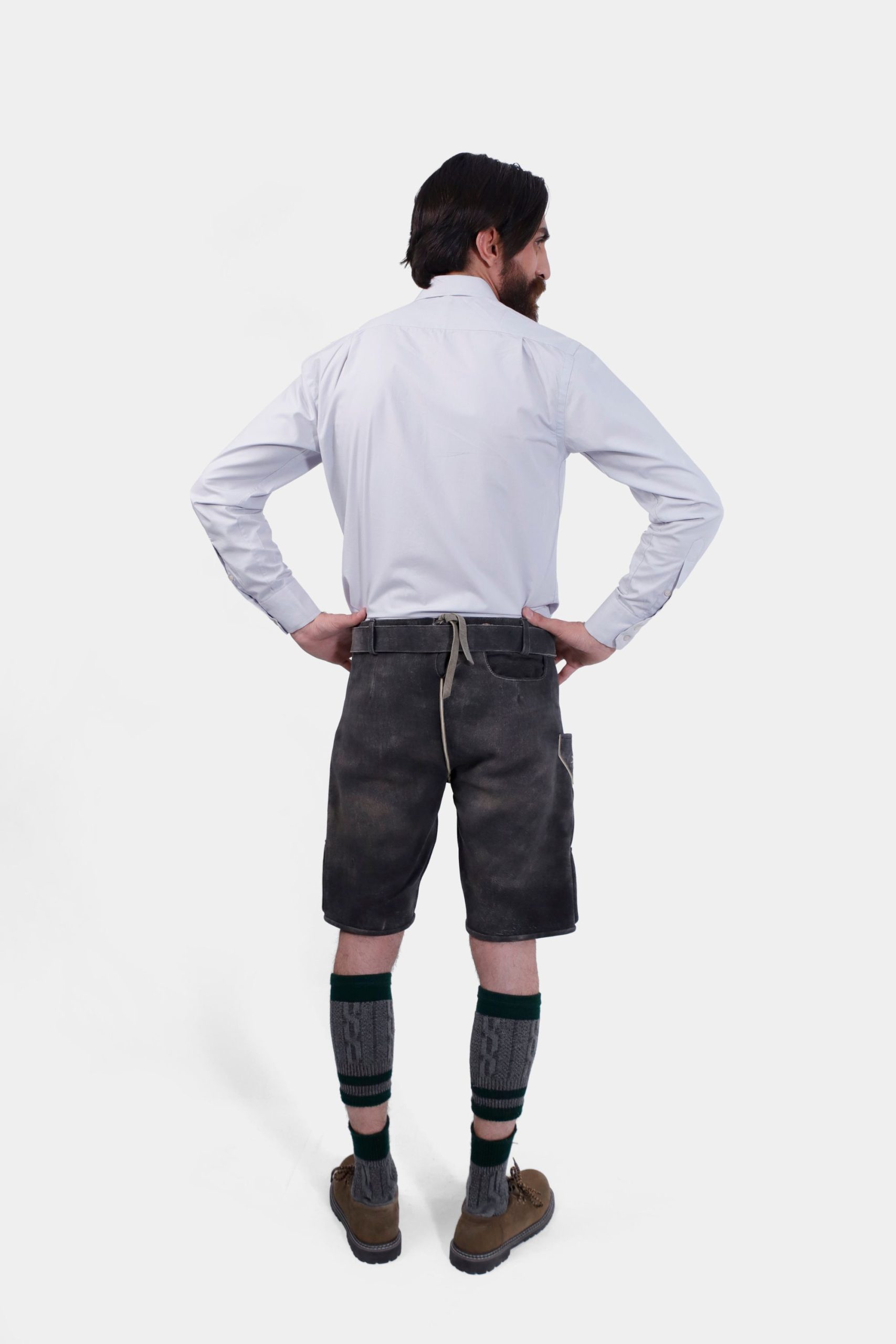 Introducing the exquisite Black Forest Lederhosen, a perfect blend of tradition and contemporary style. Crafted from premium goat suede lederhosen, this Lederhosen feature a striking color known as Shadowed Pewter, exuding sophistication and durability. Designed to sit comfortably at short length, they offer a versatile and flattering fit for any occasion.