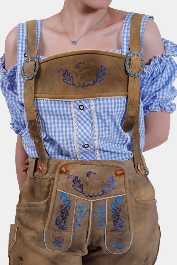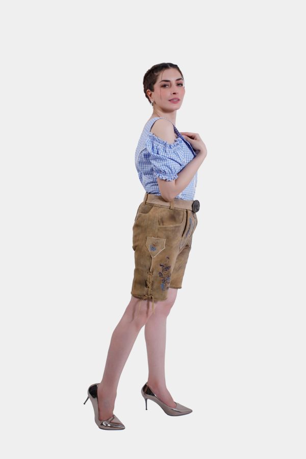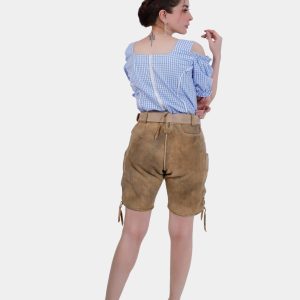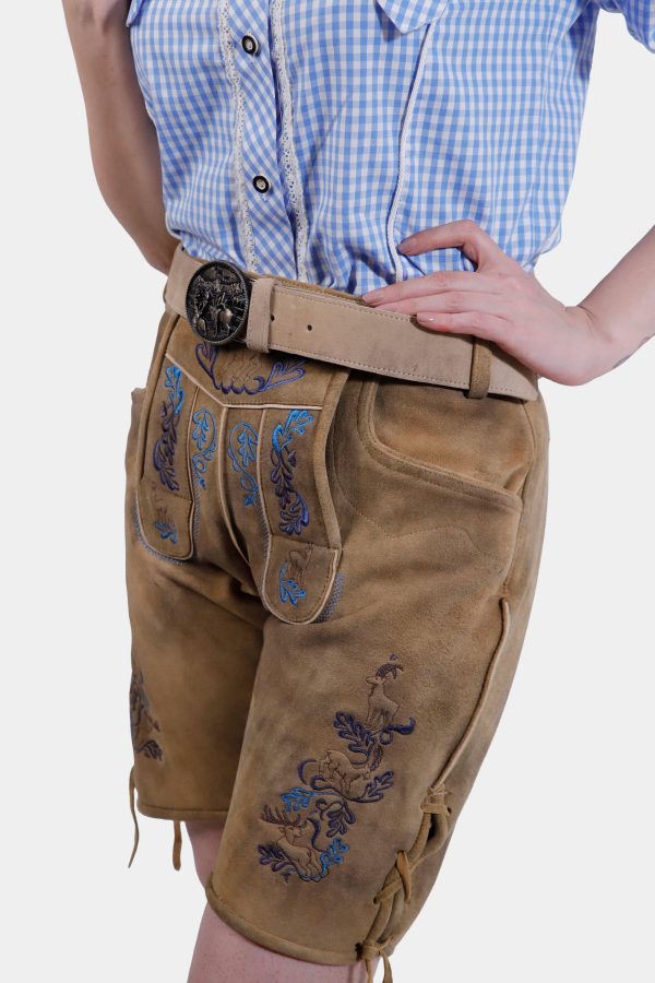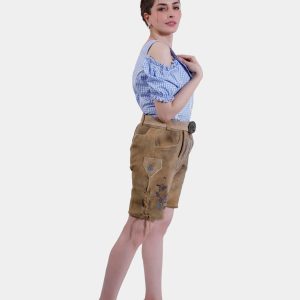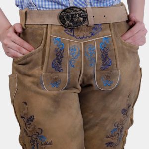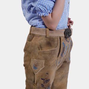Step into timeless elegance with the Clara Schumann Lederhosen, a perfect blend of tradition and style. These exquisite shorts are crafted from premium goat suede lederhosen, offering a luxurious feel and durability. The captivating Bluebell Caramel color evokes the charm of Alpine meadows, making a stunning fashion statement. Delicate embroidery in natural hues adorns the bib and legs, adding a touch of artistry to your outfit. Functional yet stylish, these Lederhosen feature two front pockets, a back pocket, and a convenient knife pocket on the side. The adjustable waistband at the back ensures a perfect fit, complemented by the laces attached to the cuffs for added comfort and style. Whether you’re embracing Bavarian traditions or looking for a unique addition to your wardrobe, the Clara Schumann Lederhosen are an exceptional choice.