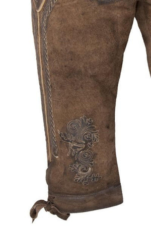 One of the key features of the Schönsee Knee length lederhosen is the intricate darkened embroidery, which can be found on the bib, along the legs, and in the form of a tendril on the knee. The craftsmanship is evident in every detail, making these pants a standout choice for any occasion.