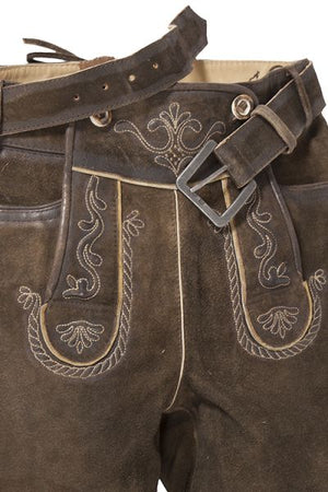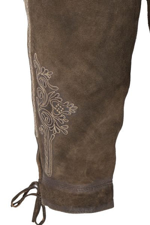 One of the key features of the Schönsee Knee length lederhosen is the intricate darkened embroidery, which can be found on the bib, along the legs, and in the form of a tendril on the knee. The craftsmanship is evident in every detail, making these pants a standout choice for any occasion.