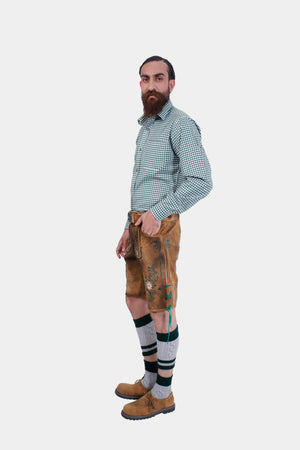 Introducing the Christoph Waltz Lederhosen for men, a masterpiece of traditional craftsmanship and contemporary style. Tailored from premium goat suede leather, these shorts exemplify elegance with their rich Baroque Maple color. The exquisite embroidery in natural hues adorns the bib and legs, capturing the authentic spirit of Bavarian heritage. Designed for functionality and style, these Lederhosen feature two spacious front pockets, a secure back pocket, and a practical knife pocket on the side. The adjustable back waistband ensures a perfect fit, while the detailed cuffs add a touch of sophistication. Ideal for Oktoberfest, cultural festivals, or casual gatherings, these Lederhosen blend tradition with modern flair, making them a must-have for any wardrobe.