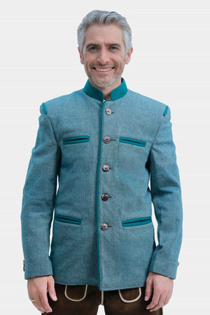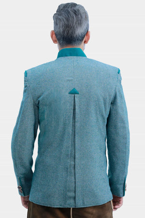 The Heidegger Trachten Jacket is a refined expression of Alpine tradition, tailored for the modern gentleman. Crafted from a premium wool-blend fabric with a fine herringbone texture, this jacket showcases a rich light teal blue base accented with deep teal green detailing. The iconic stand-up Stehkragen collar and shoulder piping add a striking, heritage-inspired touch.