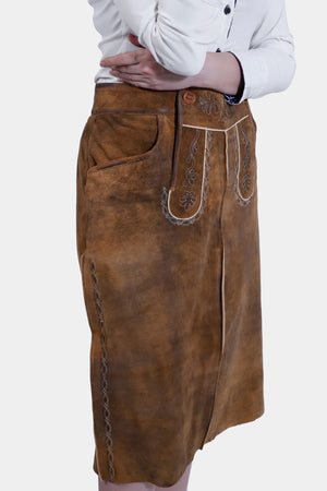 Experience timeless elegance with the Nena Lederhosen Skirt. Crafted from genuine goatskin, this ladies' leather skirt features traditional embroidery and a flattering cut. Perfect for adding a touch of sophistication to any outfit.