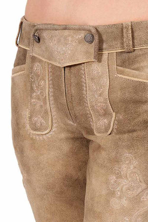 Looking for a stylish and comfortable pair of lederhosen? Look no further than our Kirchdorf short lederhosen for women. Made from soft leather in a beautiful sandy light brown color called Fenchel, these lederhosen are adorned with delicate pink embroidery on both the legs and bib strap. The small zip in the bib makes them easy to put on and wear, while the five traditional horn buttons and five silver buttons on the legs add a touch of tradition.