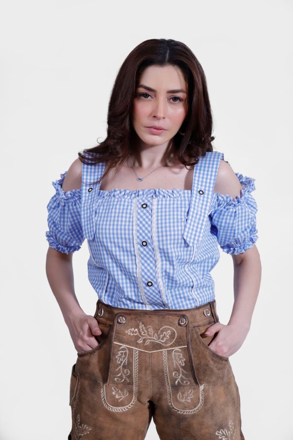 This Bavarian female costume is paired with a charming blue and white checkered Bavarian shirt. Designed for comfort with a slightly fitted silhouette, it features short sleeves with delicate ruffled edges and an off-shoulder neckline adorned with ruffled trim. The button-down front is highlighted with decorative buttons and intricate white lace trim, adding a refined touch to the overall look.