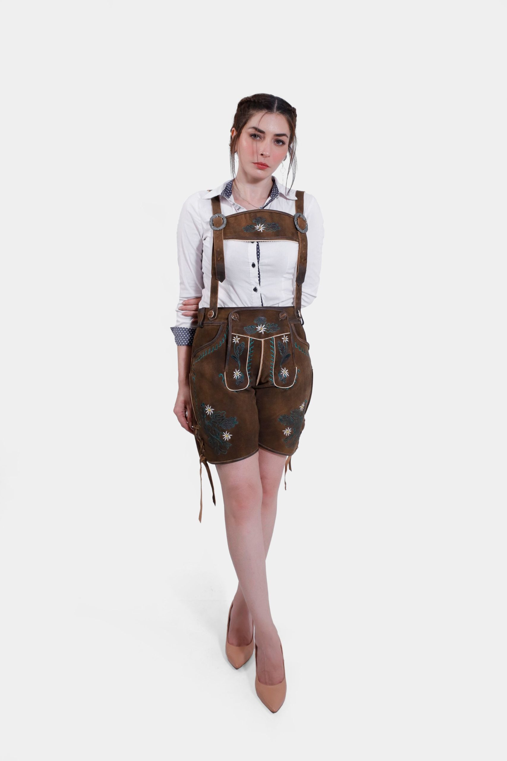 Step into timeless tradition with our Franziska Lederhosen, crafted for both comfort and style. These womens lederhosen pants are made from premium goat suede leather in a rich Alpine Mocha color, offering a luxurious feel and durable wear. The natural color embroidery on the bib and legs adds a touch of elegance, making these lederhosen stand out at any event. Practicality meets tradition with two front pockets, one back pocket, and a handy knife pocket on the side. The waistband at the back and cuffs ensures a perfect fit, while the brown horn buttons on the bib provide a classic finish. Designed with a focus on detail and heritage, the Franziska Lederhosen are perfect for anyone looking to celebrate their roots with style.