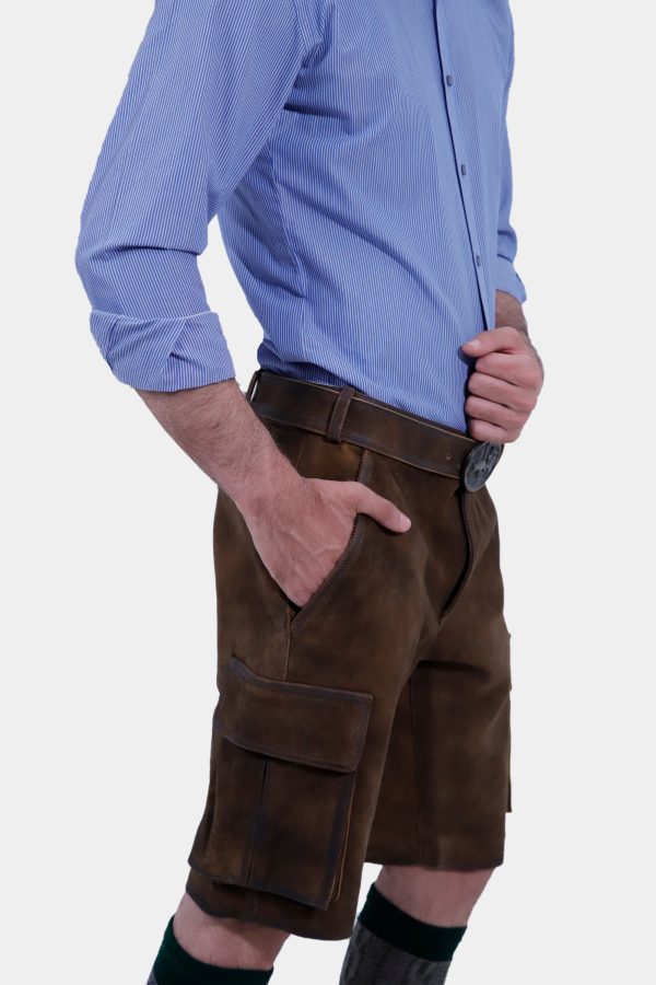 Step into tradition with a twist of practicality with our “Galileo Cargo Lederhosen.” These lederhosen leather shorts in Rustic Oak Brown are crafted from premium goatskin leather, offering a perfect blend of durability and style.these leather cargo shorts have four front pockets, two convenient back pockets. The adjustable waistband, secured with leather ties, ensure a comfortable fit. Traditional brown horn button on the front add an authentic touch. While matching belts and suspenders are optional, the Galileo Cargo Lederhosen are ready to complement any festive occasion or casual outing with their timeless appeal and functional design. Make these your go-to choice for comfort and classic Bavarian charm.