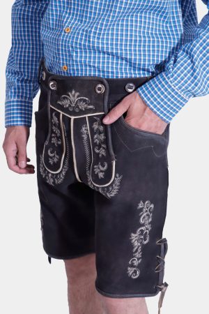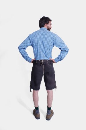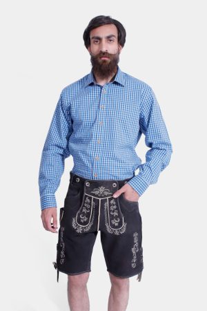 Paired with the Lederhosen is a classic blue checkered shirt made from high-quality cotton. The shirt’s vibrant color and timeless design provide a perfect contrast to the black Lederhosen, creating a balanced and visually appealing ensemble. The shirt is both breathable and comfortable, ideal for all-day wear during festive activities.