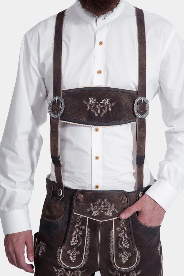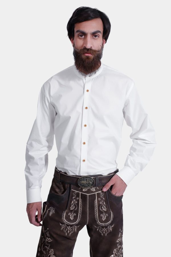 Paired with the Lederhosen shorts is a crisp white traditional shirt. Made from high-quality cotton, this shirt offers breathability and comfort. The classic design features wooden buttons and a mandarin collar, adding a touch of sophistication to the outfit.
