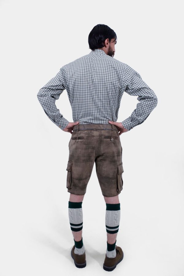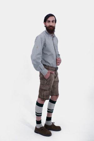 Elevate your traditional attire with the Harrison Cargo Lederhosen. These men’s oktoberfest shorts lederhosen, in the rich grey shade, are meticulously crafted from premium goatskin leather. There is no traditionaly embroidery on the bib and legs showcases artisanal craftsmanship, making a statement of elegance and modern tradition. Practicality meets style with four front pockets and two back pockets, ensuring you’re always prepared. The standout cargo pockets provide ample space for your essentials, making lederhosen men as practical as they are stylish. Perfect for festive gatherings and cultural celebrations, the Harrison Cargo Lederhosen is a must-have for those who appreciate quality and heritage.