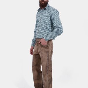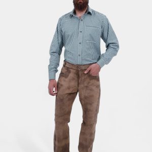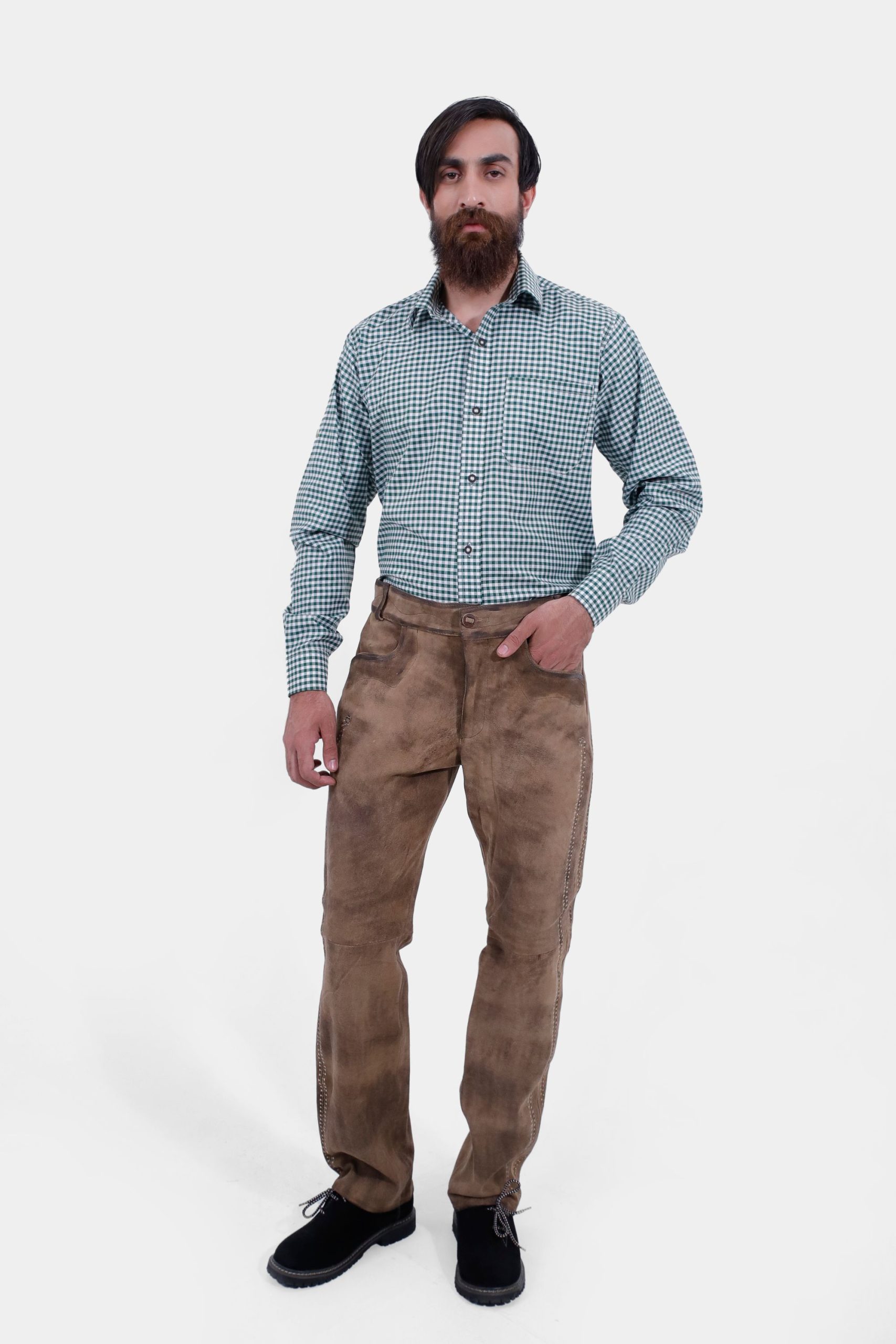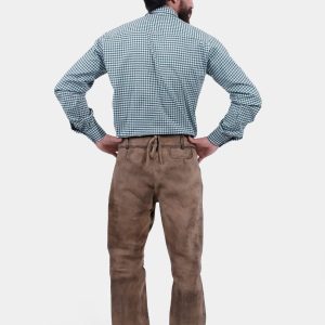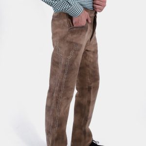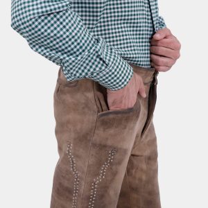 These ankle-length lederhosen are designed with exquisite traditional embroidery on the sides. This intricate detailing showcases the artistry and attention to detail that Bavarian clothing is known for. The rich taupe color adds to the classic look, making you stand out at any event.