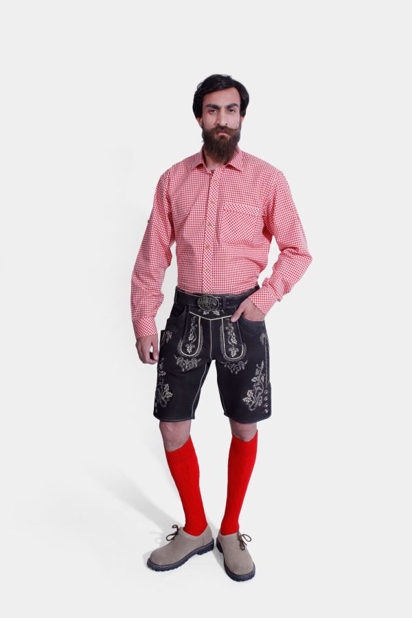Complementing the Lederhosen is a classic Bavarian shirt in a lively red and white checkered pattern. This comfort-fit shirt is tailored for a modern yet traditional look. The long sleeves and neatly designed collar add an element of timeless elegance, while the horn buttons and retro check pattern enhance its authenticity. The shirt’s precise tailoring and crisp appearance make it versatile for various occasions, from festive events to casual outings.