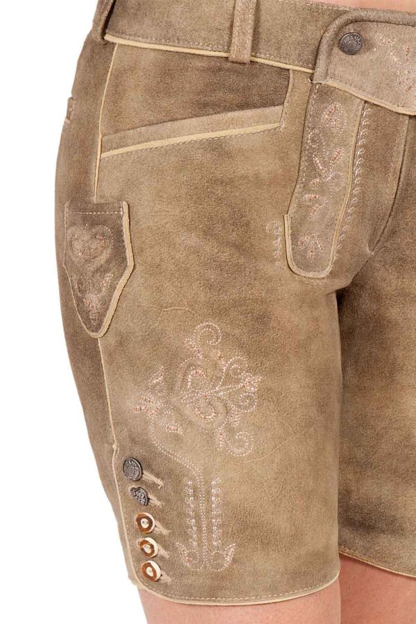 Looking for a stylish and comfortable pair of lederhosen? Look no further than our Kirchdorf short lederhosen for women. Made from soft leather in a beautiful sandy light brown color called Fenchel, these lederhosen are adorned with delicate pink embroidery on both the legs and bib strap. The small zip in the bib makes them easy to put on and wear, while the five traditional horn buttons and five silver buttons on the legs add a touch of tradition.