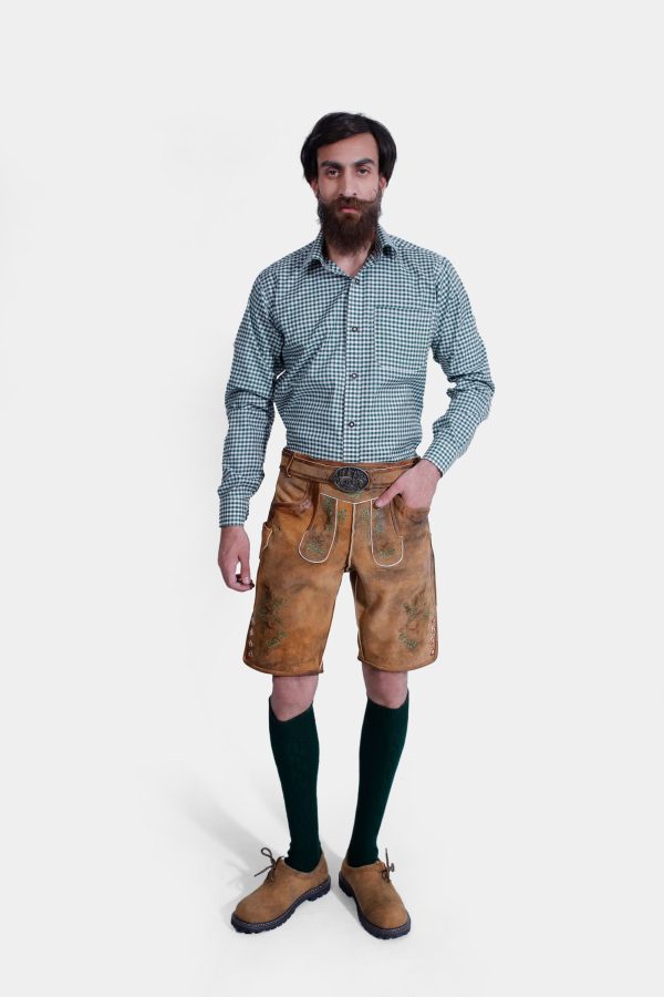 Step into Bavarian tradition with the Lars Eidinger Lederhosen Outfit. This ensemble features tan Lederhosen shorts with green embroidery, a green checkered shirt, brown suede shoes, and green knit socks, combining comfort and timeless style for any cultural celebration.