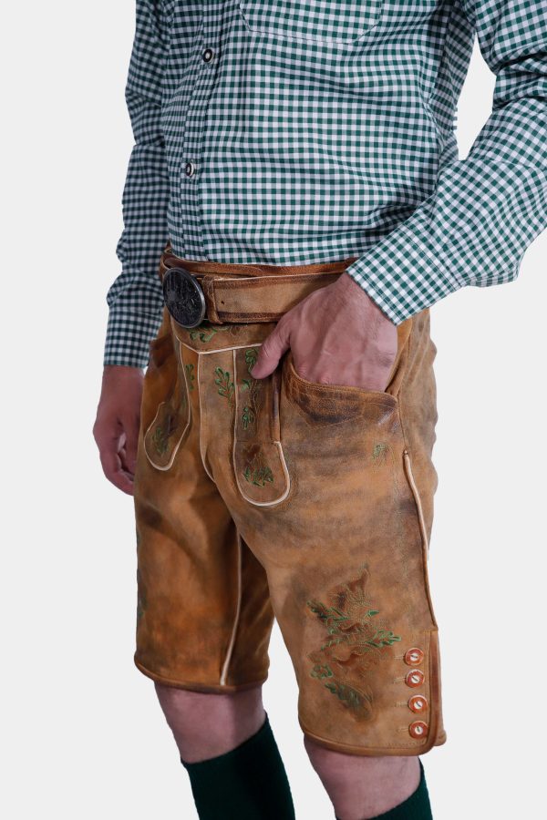Embrace the essence of Bavarian tradition with these meticulously crafted Lars Eidinger Lederhosen shorts. Made from premium goat suede leather, they feature delicate green embroidery and intricate stitching, ensuring both durability and a timeless style. The adjustable side laces and robust belt with a detailed buckle provide a snug and comfortable fit, perfect for festive occasions or cultural celebrations.