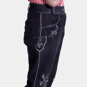 Introducing the “Leni Riefenstahl Lederhosen” – a masterpiece of traditional craftsmanship blended with modern elegance. These knee-length lederhosen in the luxurious shade of Ebony Stag Black are made from premium goatskin leather, ensuring both durability and comfort. The intricate natural-colored embroidery adorns the bib and legs, adding a touch of artistic flair. Designed for practicality, this pair features two front pockets and a handy knife pocket on the side. The waistband at the back provides a tailored fit, enhanced by brown horn buttons on the bib and decorative laces attached to the cuffs. Perfect for any festive occasion, the Leni Riefenstahl Lederhosen combines timeless style with contemporary details, making it a standout piece in any wardrobe.
