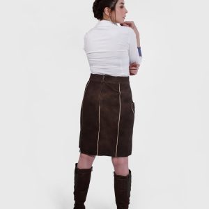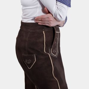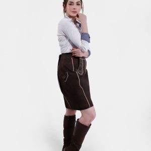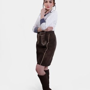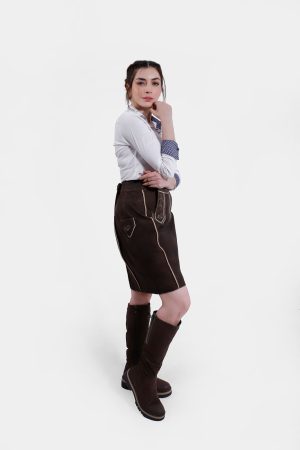 Introducing the Lillian Lederhosen Skirt, a perfect blend of traditional Bavarian charm and modern style. This exquisite lederhosen style skirt, in the rich and inviting hue of Tyrolean Chocolate, is crafted from the finest goat suede leather. The luxurious texture and superior craftsmanship ensure both comfort and durability, making it a timeless addition to your wardrobe.
