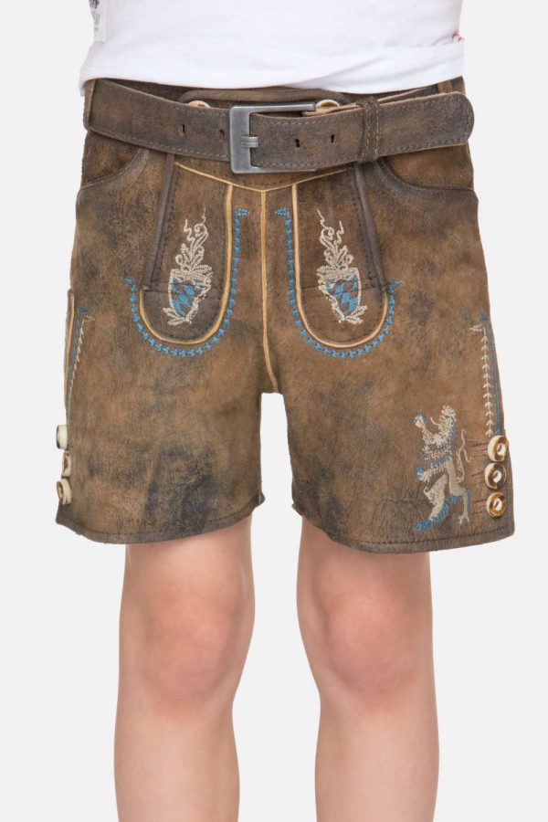 Introducing the delightful “Ludwig lederhosen Short” children’s leather pants by Bayerische Alpen! Crafted with utmost care and using high-quality tanned wild buck leather, these pants boast a unique stag-inspired appearance that is sure to captivate young hearts. The exquisite detailing showcases embroidery in a charming beige-blue hue, meticulously crafted following traditional Bavarian patterns, which flawlessly complements the buttons designed to resemble staghorn. A true centerpiece, the embroidered Bavarian lion proudly adorns these pants, adding a touch of regal charm.