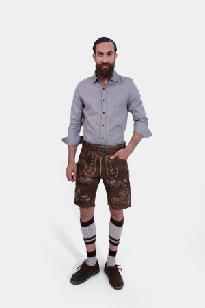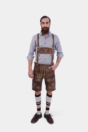 Experience the pinnacle of traditional Bavarian craftsmanship with the Matthaus Lederhosen for men. These men’s lederhosen shorts Matthaus are crafted from premium goat suede leather in a rich Burnished Hazel hue, offering both durability and a luxurious feel. The intricate Authentic Bavarian embroidery in natural colors adorns the bib and legs, showcasing exquisite attention to detail.