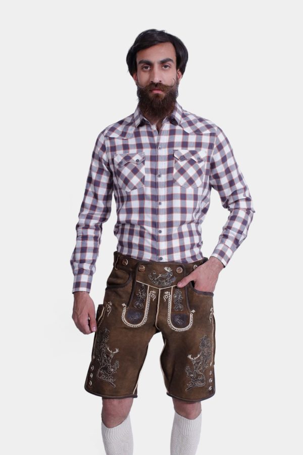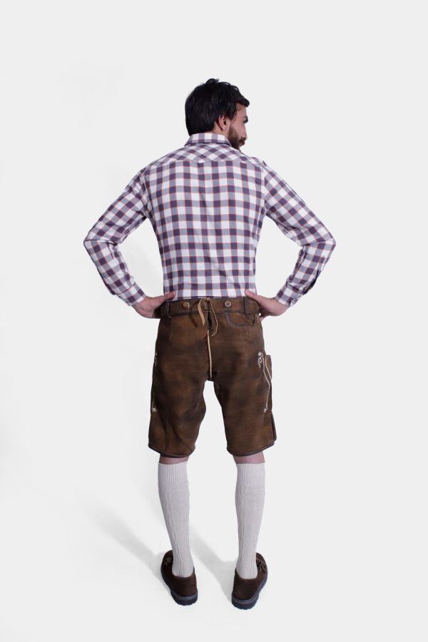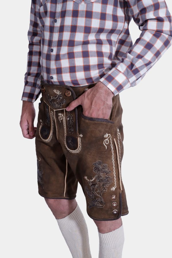 Introducing the “Max Planck Lederhosen” – a timeless piece of traditional Bavarian attire. These mens lederhosen shorts, in a stunning Rustic Maple color, are crafted from premium goat suede leather, providing both durability and a luxurious feel. Designed to sit just above the knee, they offer a perfect blend of comfort and style.