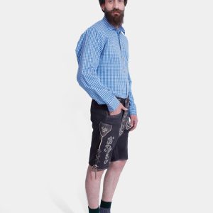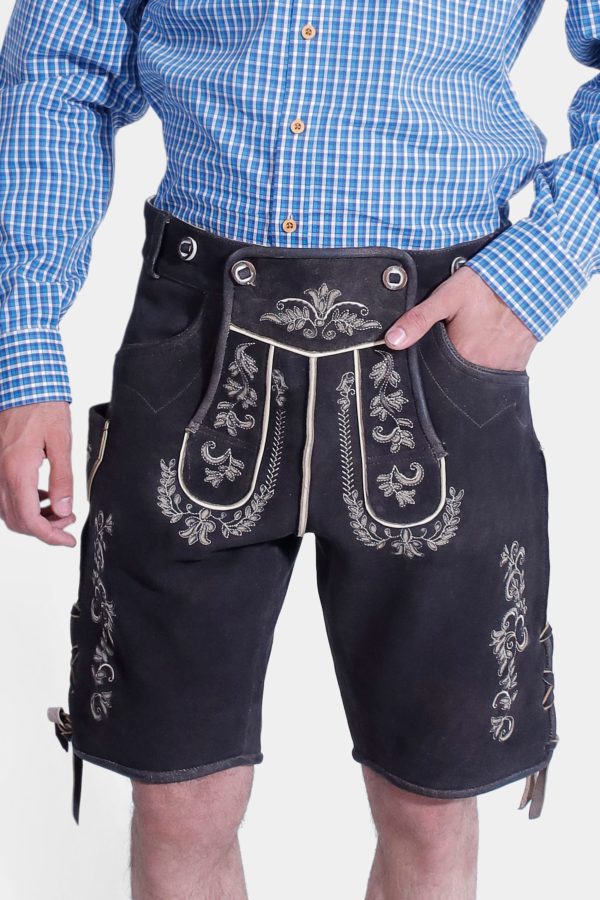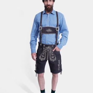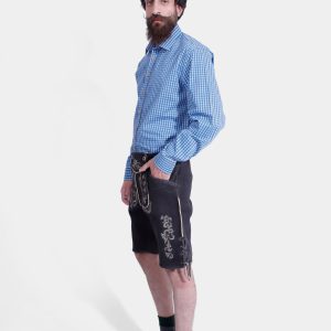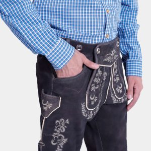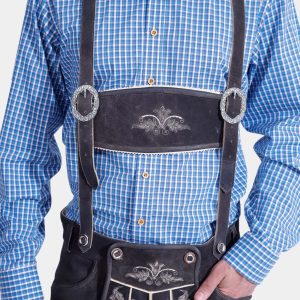 Introducing the Mountain Majesty Lederhosen for men: a stunning embodiment of traditional craftsmanship blended with contemporary style. These lederhosen are meticulously crafted from premium-quality black leather that promises durability and comfort, whether you’re attending a festive Oktoberfest gathering or embracing your heritage daily. The detailed embroidery, featuring alpine-inspired floral motifs in a contrasting silver thread, adds an element of elegance and authenticity to the ensemble. The adjustable lacing at the waist and legs ensures a customizable fit, catering to various body shapes.