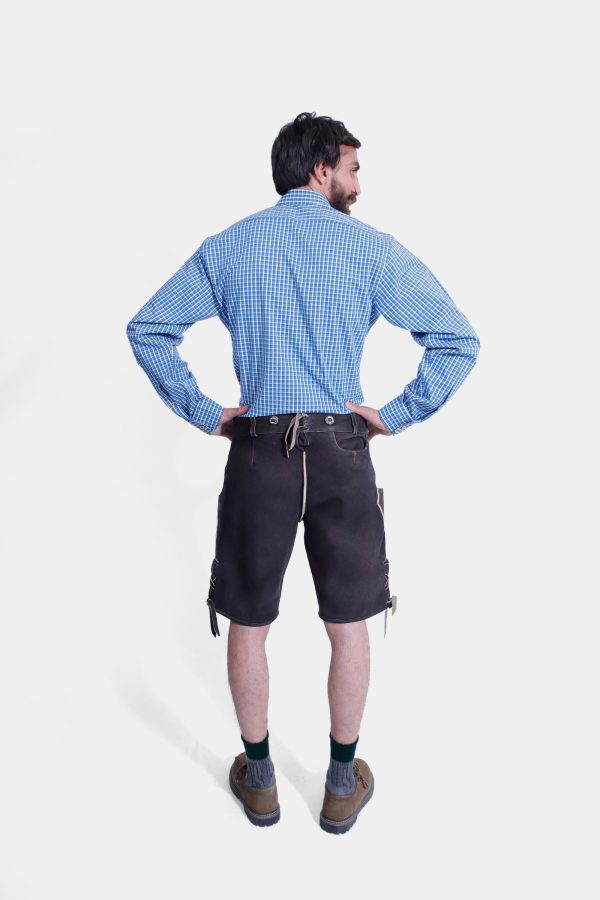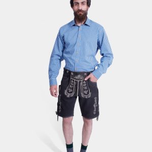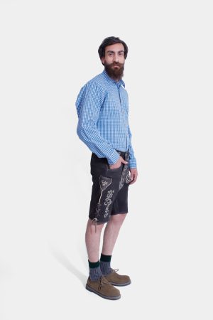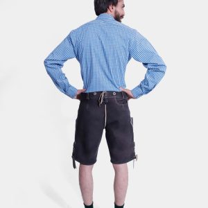 The lederhosen also include spacious front flap pockets that are both functional and stylish, allowing you to keep essentials like your phone and wallet secure. Paired with a classic blue gingham check shirt, this outfit not only pays homage to Bavarian culture but also offers versatility, making it suitable for casual outings or more formal festive occasions. Whether you’re dancing, sitting, or participating in festival activities, these lederhosen provide freedom of movement and an undeniable touch of class.