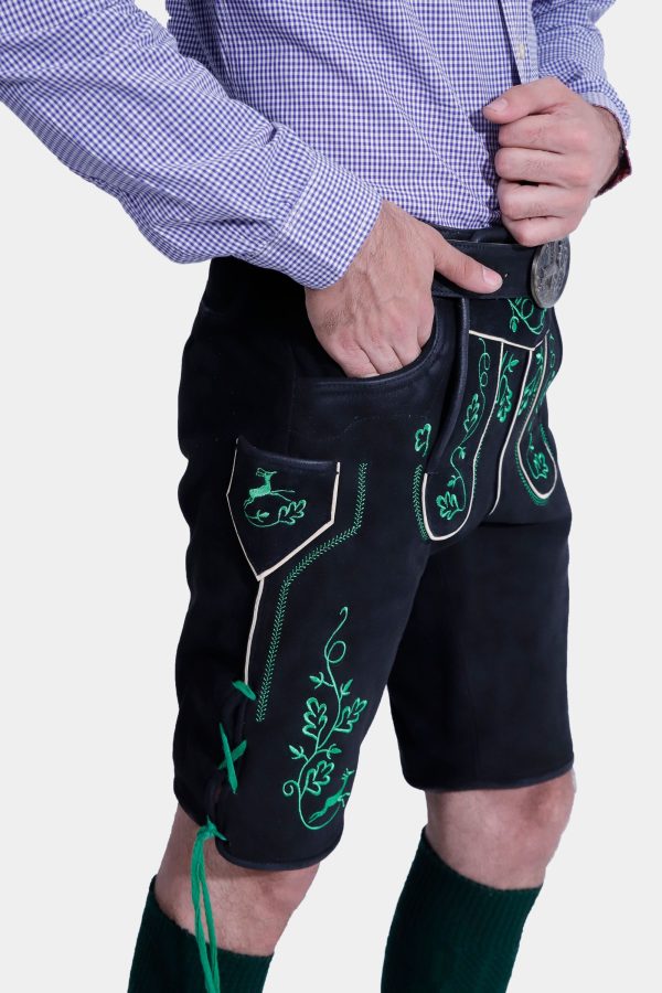 Celebrate Bavarian tradition with these striking Lederhosen shorts. Crafted from premium black leather, these shorts are designed to provide durability and comfort while showcasing impeccable style. The rich black leather is adorned with vivid green embroidery, featuring intricate floral patterns that add a touch of elegance and authenticity to the design.