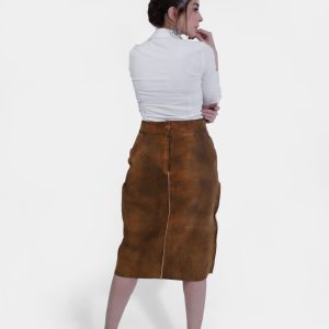 Pair it with a crisp blouse and heels for a polished and sophisticated outfit suitable for formal events. For a more casual ensemble, style it with a relaxed shirt and ankle boots. The possibilities are endless, making this leather skirt a versatile and timeless piece.The dark leather is beautifully complemented by light piping, creating a fashionable contrast that catches the eye. This attention to detail enhances the overall aesthetic of the skirt, making it a standout piece in your wardrobe.