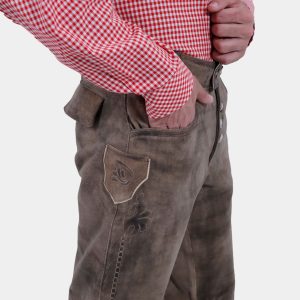 Adorned with intricate embroidery in natural colors along the side legs, these Lederhosen reflect timeless craftsmanship. The embroidery not only enhances the aesthetic appeal but also showcases the rich heritage of traditional German attire. Practicality is not compromised with two front pockets, a back pocket, and a convenient knife pocket on the side, providing ample storage for your essentials.