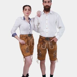 The man’s ensemble complements the woman’s attire perfectly. It includes a white button-down shirt, exuding a clean and sophisticated appeal. The golden-brown leather shorts, matching those of the woman’s, are adorned with similar intricate embroidery. The look is completed with classic brown shoes and green knee-high socks, adding a hint of color and tradition.
