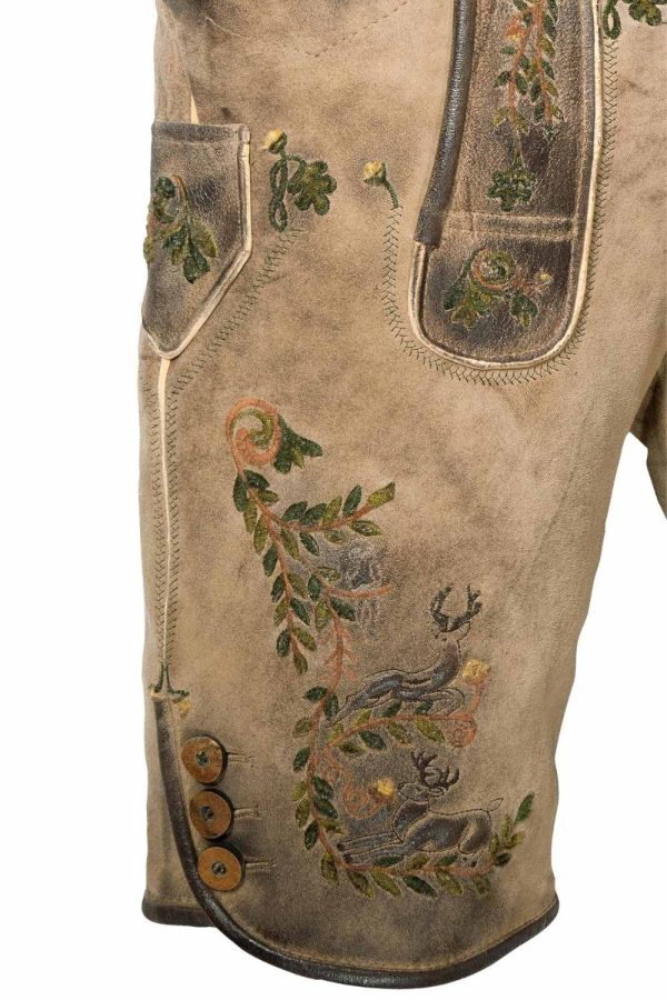 Introducing our Niagara Falls Lederhosen Shorts with Colorful Embroidery – the perfect addition to your traditional costume collection. These traditional german leather shorts are designed to make you stand out from the crowd with their eye-catching green leaf tendrils, oak leaves, brown jumping game, and yellow and brown details embroidered on a sandy light brown base.