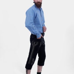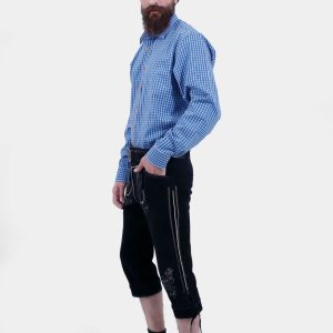 Looking for an authentic piece of Bavarian culture to add to your wardrobe? Look no further than the Bavarian Elite Bundhosen in black with straps! This knee-length Oktoberfest black Bundhosen is expertly crafted in deep black, with natural-colored embroidery running along the bib, legs, and knees. The attention to detail on this piece is truly remarkable, making it a standout addition to any traditional Bavarian outfit.