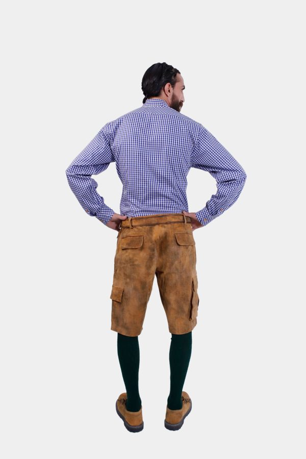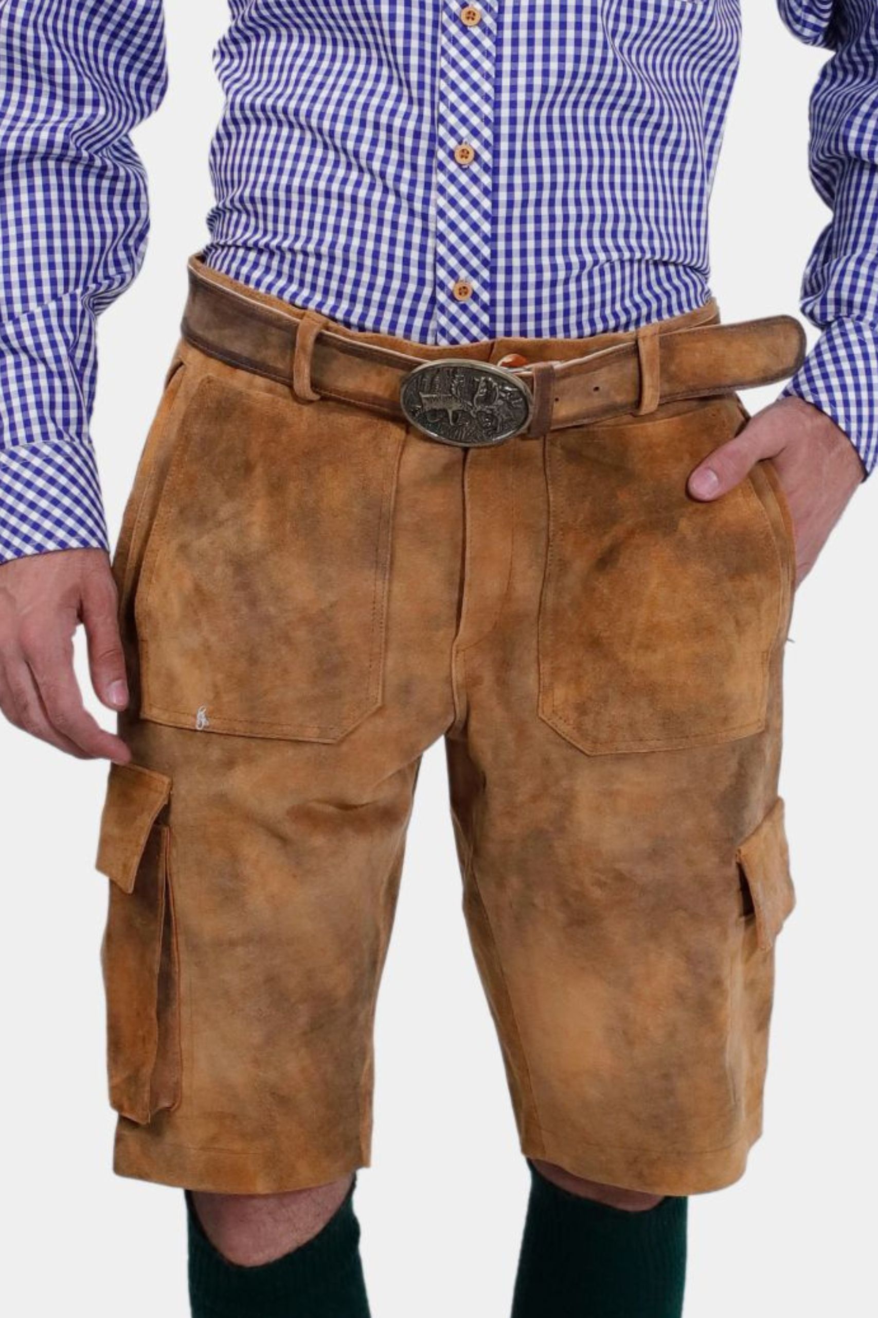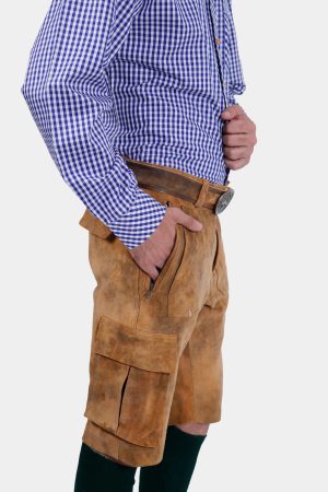 Introducing the “Paul Walker Cargo Lederhosen” – a perfect blend of rugged charm and traditional elegance. These lederhosen leather shorts, crafted from luxurious goat suede leather, are presented in the unique and exotic color of Sahara Caramel. The intricate embroidery in natural color graces the bib and legs, adding a touch of sophistication to the durable design. Featuring an impressive four front pockets, two back pockets, and a convenient knife pocket on the side, these lederhosen offer ample storage for your essentials. The waistband at the back and on the cuffs ensures a comfortable, adjustable fit, while the brown horn buttons on the bib add a rustic yet refined finishing touch. Perfect for outdoor adventures or cultural festivities, the Paul Walker Cargo Lederhosen stand out with their superior craftsmanship and attention to detail. Note: Matching belts and suspenders are not included, allowing for personalized styling options to suit individual preferences.