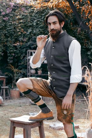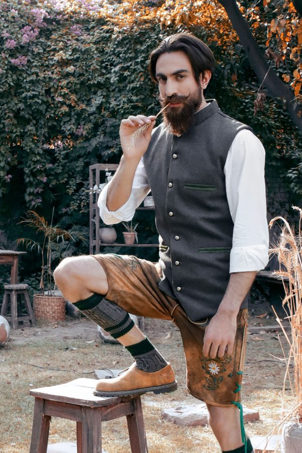 Elevate your Bavarian style with the Josh Peck Trachten Vest, a flawless blend of tradition and modern sophistication. Crafted from premium wool, this vest offers a structured yet comfortable fit, featuring a refined stand-up collar and antique-style metal buttons. Its rich charcoal grey shade, accented with subtle green pocket trims, brings a distinguished touch to its classic design.