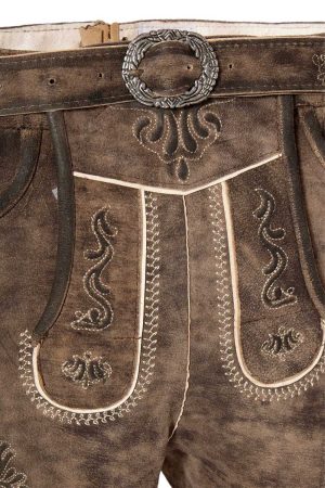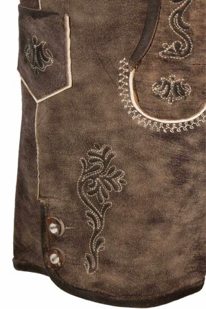The pretty embroidery in the form of leafy vines applied to the leg and bib gives the lederhosen a natural and traditional look. The brown horn buttons on the waistband and leg slits, bright seam edges, and a pretty decorated bib all add to the lederhosen’s charm.