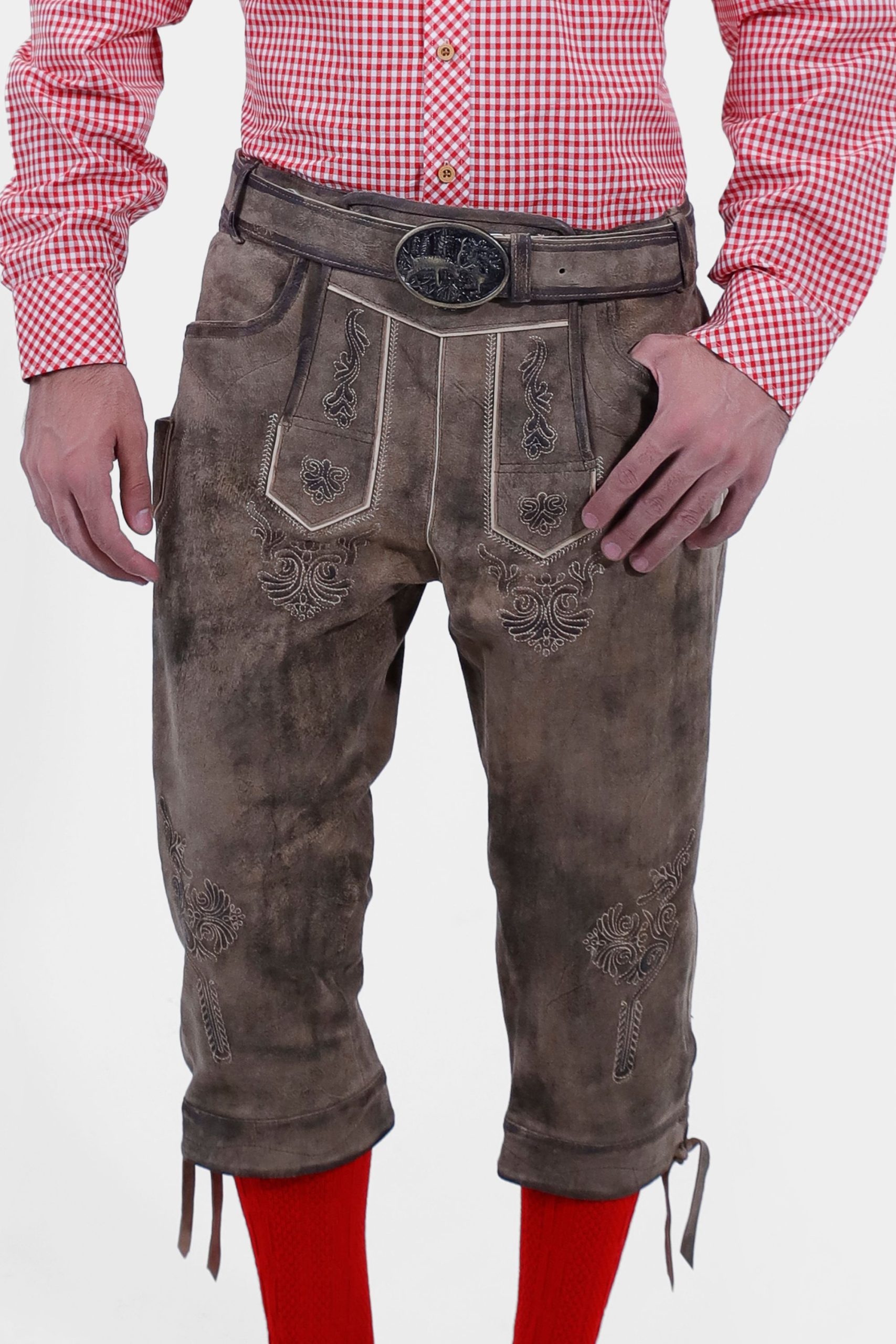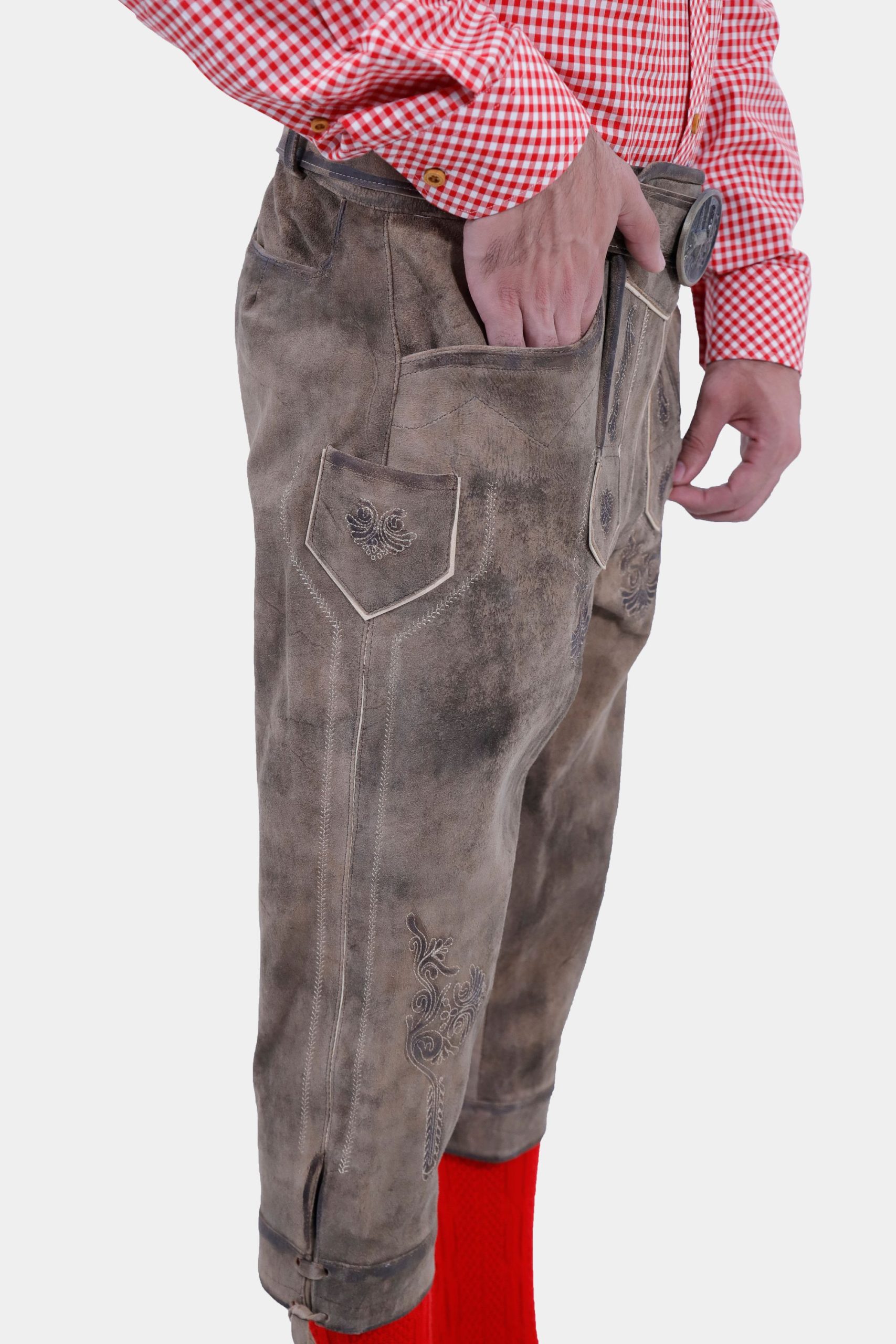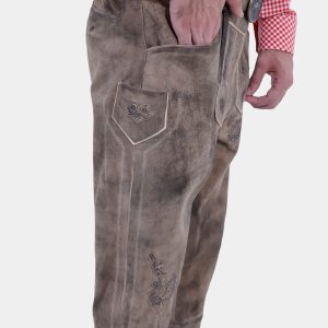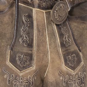 The antique Ziller color, a warm medium brown with a used look, gives this lederhosen a unique and rustic appearance. The embroidery on the legs and bib is done in a pleasant tone-on-tone style, adding a touch of subtle elegance to the overall design.