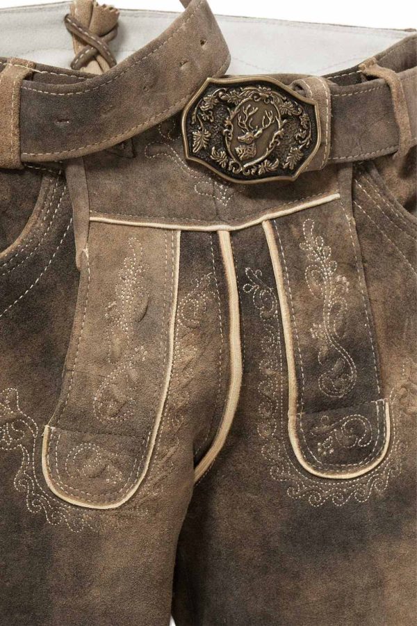 The pretty embroidery on the bib and along both legs meanders discreetly, offering a noble contrast in nature. The three horn buttons at the end of each leg with a red buttonhole add the perfect finishing touch to the look. The included belt with an old gold buckle provides the perfect fit. The width of the waistband at the back can be adjusted with a leather band, ensuring a comfortable and snug fit.