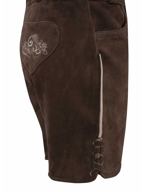 To ensure a perfect fit, our Loreen lederhosen can be laced individually at the waistband, providing you with more flexibility and comfort. Additionally, there are two pockets on the front and a heart-shaped pocket on the back, all decorated with beautiful embroidery, giving you plenty of space to keep small belongings close at hand.