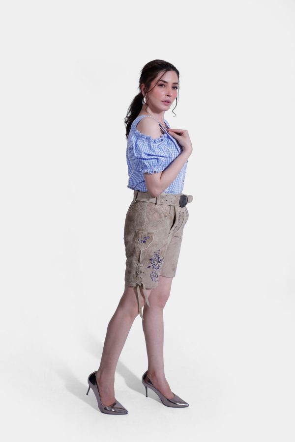Introducing the Triana Heritage Lederhosen, a perfect blend of tradition and elegance. These women’s oktoberfest lederhosen, crafted from premium goatskin leather, come in the exquisite shade of Sandy Sage, making them a standout piece in any wardrobe. The intricate embroidery in natural colors on the bib and legs adds a touch of timeless Bavarian charm.
