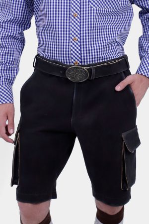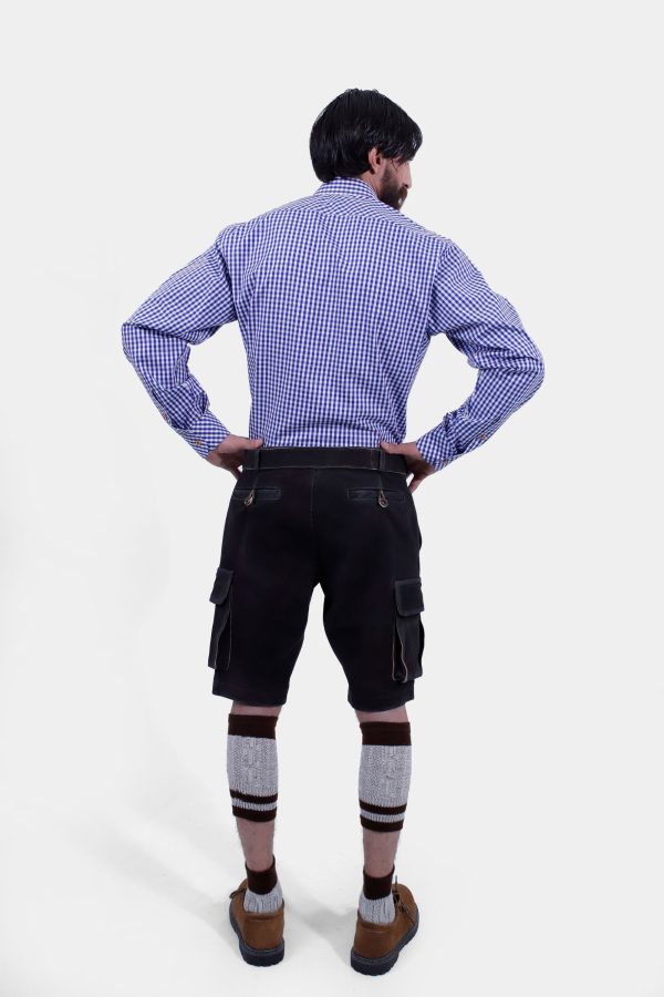 Step into a world of heritage with our Vespucci Cargo Lederhosen. These men’s lederhosen cargo shorts are crafted from luxurious goatskin leather in an exquisite Midnight Walnut shade, combining durability with a sophisticated look. Featuring two front pockets on the legs and two back pocket, these cargo modern lederhosen offer both style and functionality. The traditional brown horn buttons on the front add a touch of authentic charm. Perfect for Oktoberfest or any festive event, the Vespucci Cargo Lederhosen will make you stand out.
