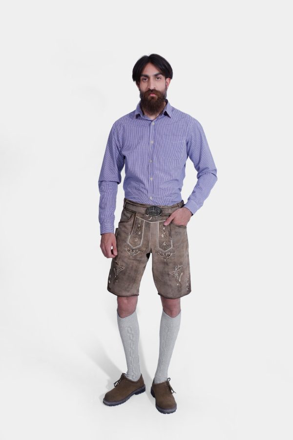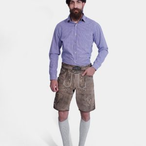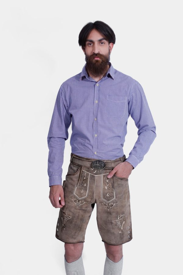 Paired with the Lederhosen is a traditional Bavarian shirt, designed for comfort and style. This shirt is expertly tailored, blending classic elements with modern fit. The long sleeves and neatly designed collar offer a sophisticated look, complemented by classic buttons, making it perfect for any setting.