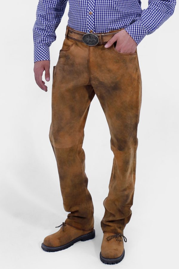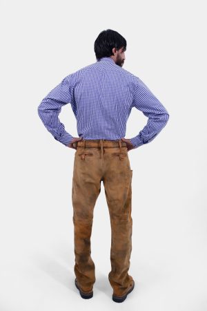 The tan brown color gives these Lederhosen a classic, rustic appeal, ideal for those who appreciate timeless style. Adorned with traditional embroidery on the front pockets, these trousers reflect meticulous attention to detail and a deep respect for Bavarian artistry. The embroidery enhances the overall aesthetic, making these Lederhosen a standout piece in any wardrobe.